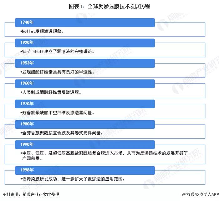 1948年,Nollet首次發現滲透現象開始,全球各國開始不斷研發反滲透膜技術,到20世紀90年代出現低壓反滲透復合,為第三代反滲透膜,膜性能大幅度提高,為反滲透膜技術發展開辟了廣闊的前景。