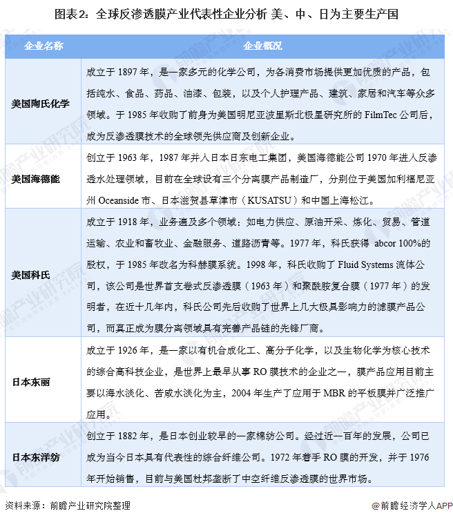 目前全球反滲透膜行業的龍頭企業主要為國際知名膜制造商,且大多都是多元化的大型企業,如美國陶氏化學、美國海德能、日本東麗等;膜業務只是其多元化戰略下的一個事業部。