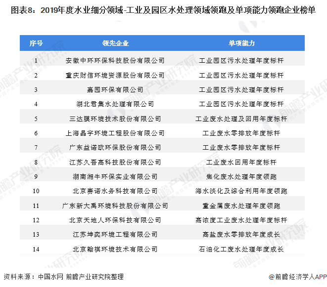 據(jù)中國水網(wǎng)公布的2019年度水業(yè)細(xì)分領(lǐng)域-工業(yè)及園區(qū)水處理領(lǐng)域領(lǐng)跑及單項(xiàng)能力領(lǐng)跑企業(yè)榜單顯示,共有14家企業(yè)入圍“領(lǐng)跑企業(yè)榜單”,具體如下表所示: