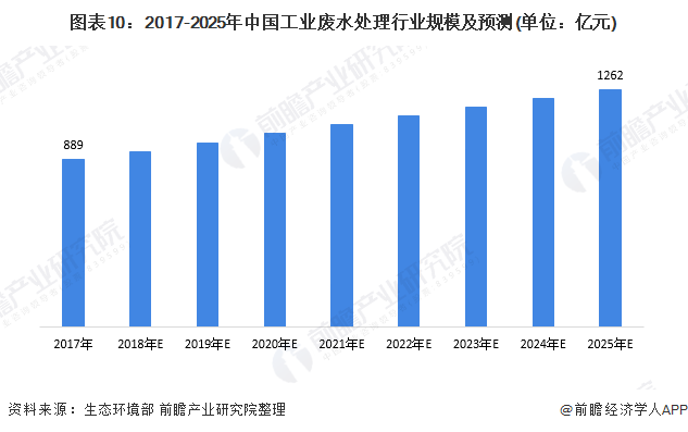 據(jù)GEP Research的研究數(shù)據(jù)顯示,2017年,我國工業(yè)廢水處理行業(yè)的市場規(guī)模約為889億元。根據(jù)市場發(fā)展情況結(jié)合政策支持情況,在“十三五”期間,我國的工業(yè)廢水處理市場規(guī)模迅速增長;“十四五”期間,隨著環(huán)保治理的不斷深入,工業(yè)廢水處理行業(yè)仍將保持穩(wěn)定增長,保守估計(jì)到2025年,工業(yè)廢水市場規(guī)模將將達(dá)到1262億元。